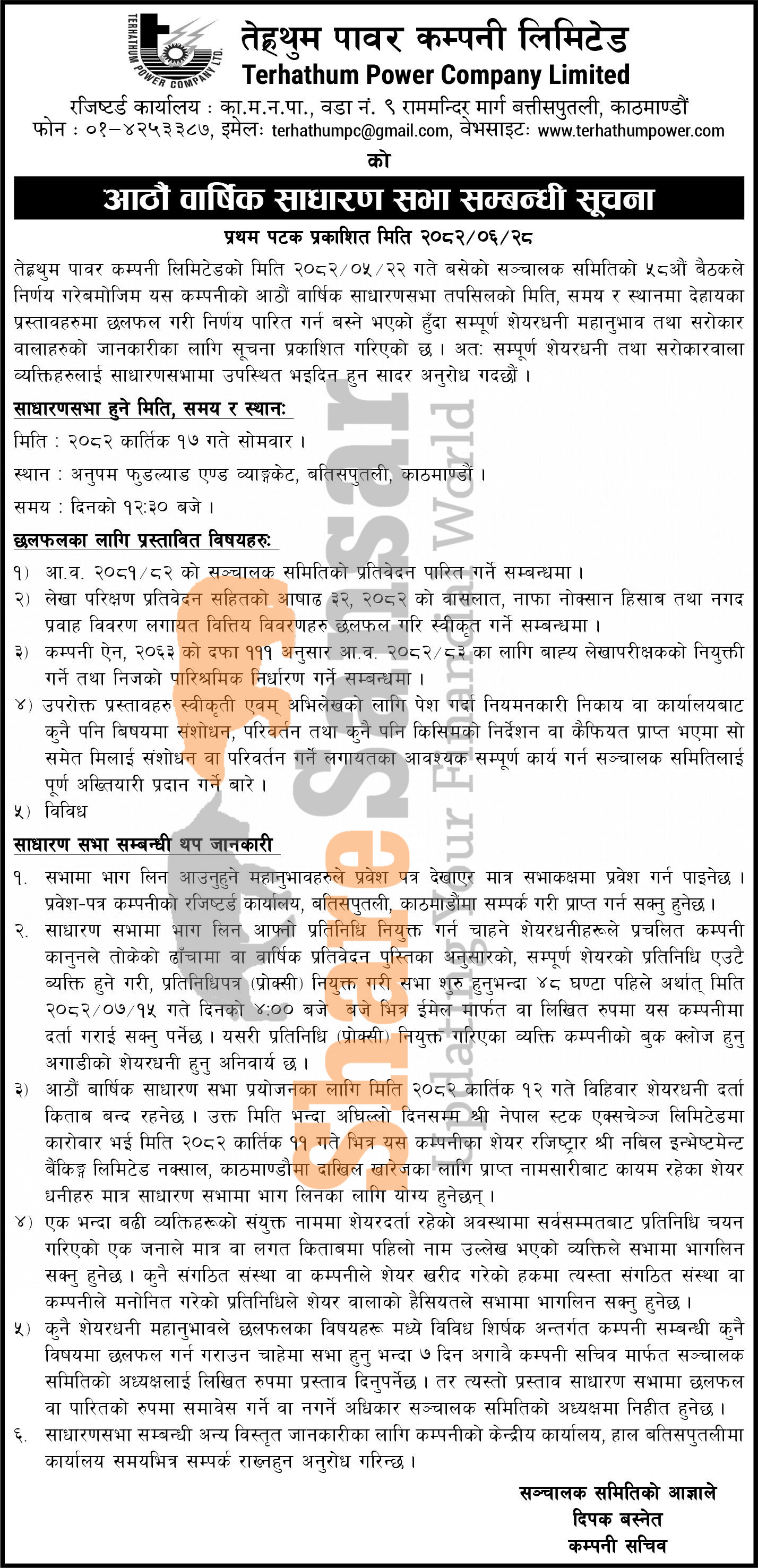 Terhathum Power Company Limited has announced its 8th AGM going to be held on 17th Kartik, 2082.
