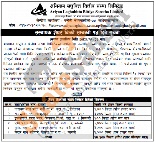 The existing promoter of Aviyan Laghubitta Bittiya Sanstha Limited is selling 14,500 shares to the other person/institutions.