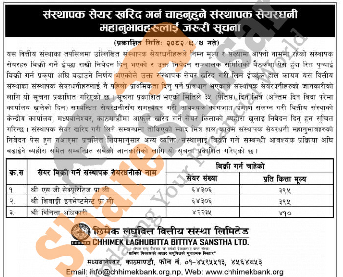The existing promoter of Chhimek Laghubitta Bittiya Sanstha Limited is selling 1,70,847 shares to its promoter shareholders.