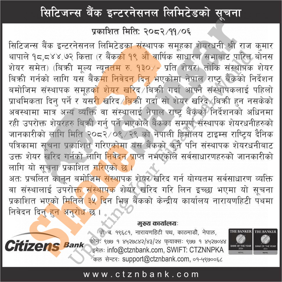The existing promoter of Citizens Bank International Limited is selling 18,844.72 shares to the general public.