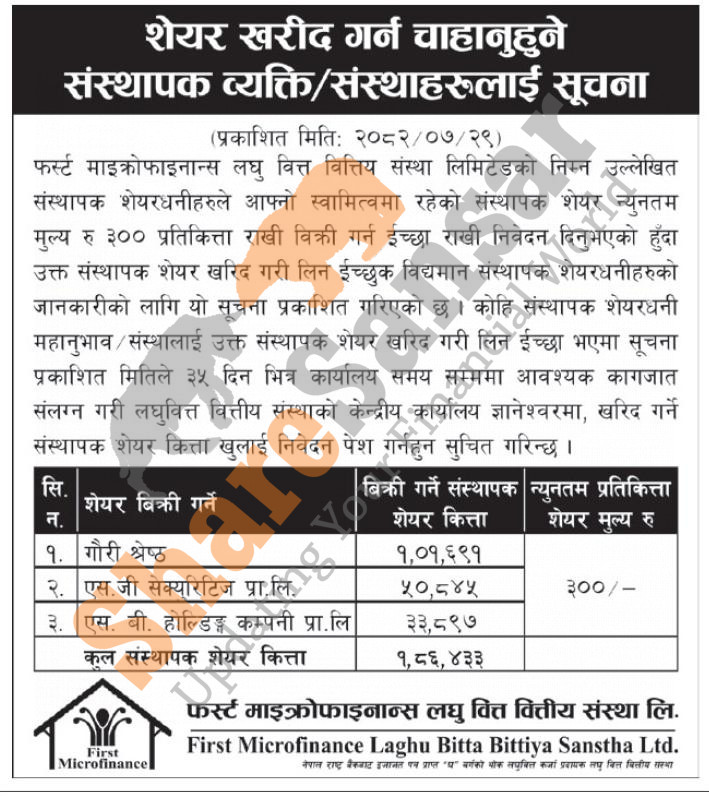 The existing promoter of First Microfinance Laghubitta Bittiya Sanstha Limited is selling 1,86,433 shares to the promoter shareholders/institutions.