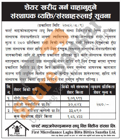 The existing promoter of First Microfinance Laghubitta Bittiya Sanstha Limited is selling 1,86,433 shares to the promoter shareholders/institutions.