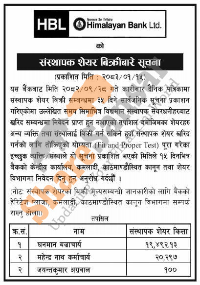 The existing promoter of Himalayan Bank Limited is selling 39,889.13 shares to the general public/institutions.