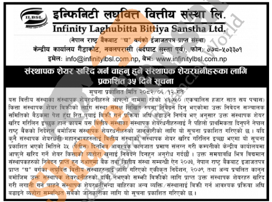 The existing promoter of Infinity Laghubitta Bittiya Sanstha Limited is selling 41,750 shares to its promoter shareholders.
