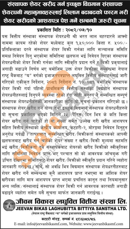 The existing promoter of Jeevan Bikas Laghubitta Bittiya Sanstha Limited is selling 1,50,000 shares to its promoter shareholders.