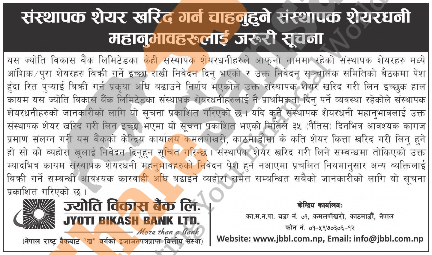 The existing promoter of Jyoti Bikash Bank Limited is selling shares to its promoter shareholders.