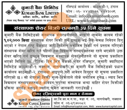 The existing promoter of Kumari Bank Limited is selling 1,02,000 shares to its promoter shareholders.