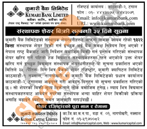 The existing promoter of Kumari Bank Limited is selling 1,322 shares to its promoter shareholders.