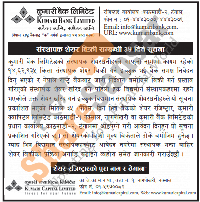 The existing promoter of Kumari Bank Limited is selling 14,62,935 shares to its promoter shareholders.