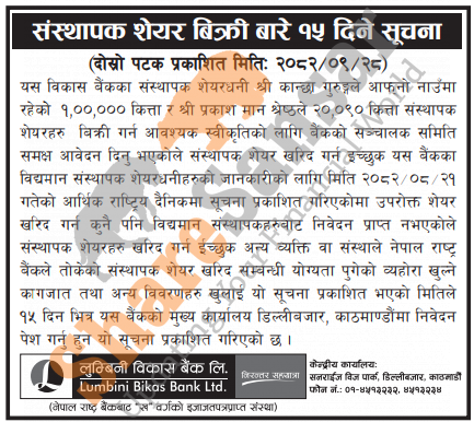 The existing promoter of Lumbini Bikas Bank Limited is selling 1,20,090 shares to the interested general public/institutions.