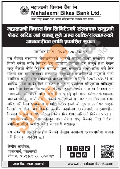 The existing promoter of Mahalaxmi Bikas Bank Limited is selling shares to the general public/institutions.