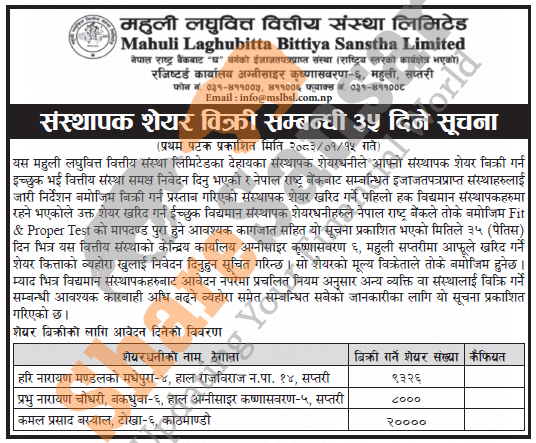 The existing promoter of Mahuli Laghubitta Bittiya Sanstha Limited is selling 37,326 shares to its promoter shareholders.