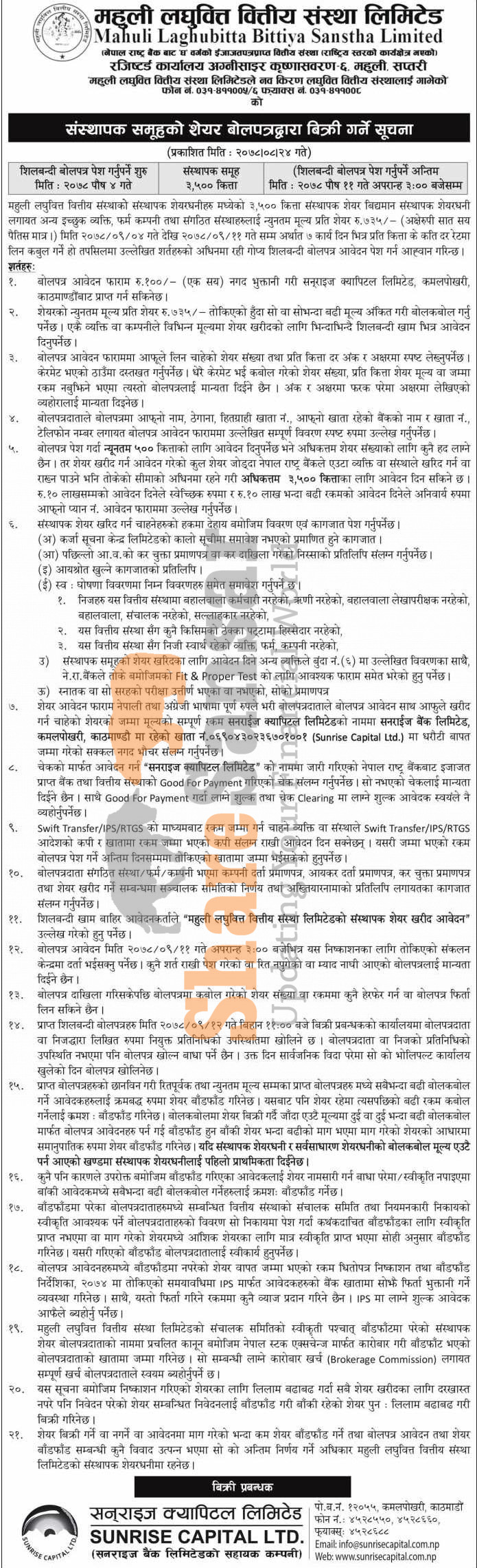 The existing promoter of Mahuli Laghubitta Bittiya Sanstha Limited is selling its 3,500 units promoter share in an auction to the general public from 4th Poush to 11th Poush, 2078.