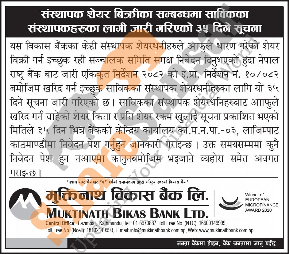 The existing promoter of Muktinath Bikas Bank Limited is selling shares to its former promoter shareholders.