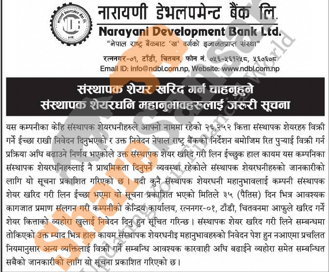 The existing promoter of Narayani Development Bank Limited is selling 26,252 shares to its promoter shareholders.