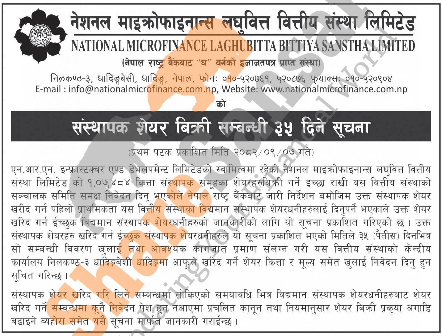The existing promoter of National Laghubitta Bittiya Sanstha Limited is selling 1,07,484 shares to its promoter shareholders.
