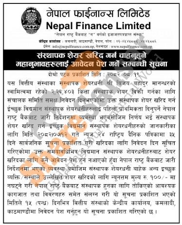 The existing promoter of Nepal Finance Limited is selling 2,26,403 shares to to general public/institutions.