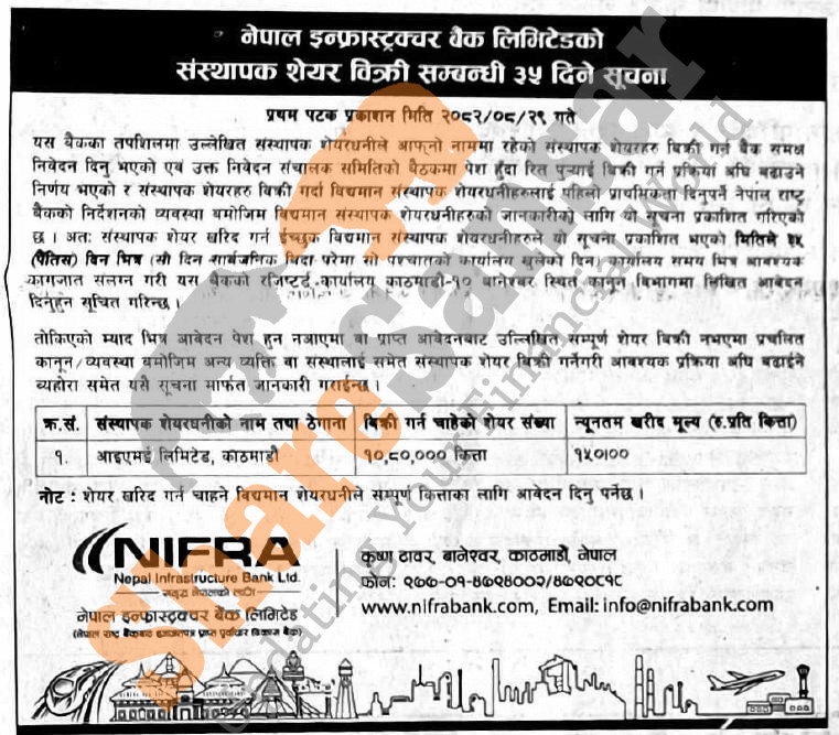 The existing promoter of Nepal Infrastructure Bank Limited is selling 10,80,000 shares to its promoter shareholders.