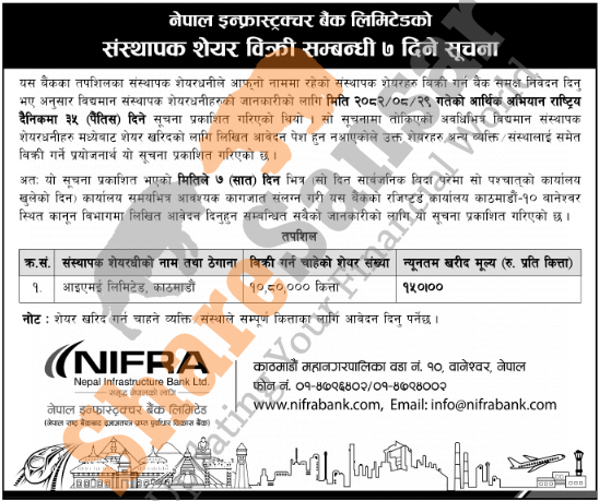 The existing promoter of Nepal Infrastructure Bank Limited is selling 10,80,000 shares to the general public/institutions.
