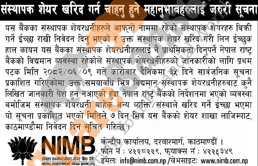 The existing promoter of Nepal Investment Mega Bank Limited is selling shares to the other person/institutions.