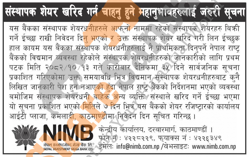 The existing promoter of Nepal Investment Mega Bank Limited is selling shares to the other person/institutions.