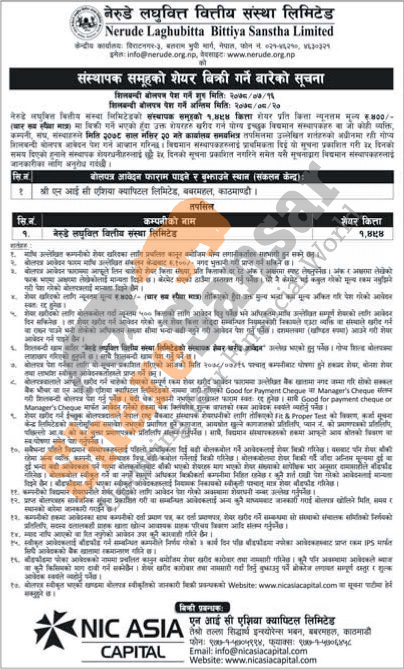 The existing promoter of Nerude Laghubitta Bittiya Sanstha Limited is selling its 1,494 units promoter share in an auction to the general public from 16th Kartik to 20th Mangsir, 2078.