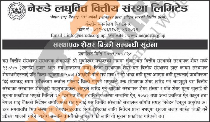 The existing promoter of Nerude Laghubitta Bittiya Sanstha Limited is selling its 21,857 unit shares to its promoter shareholders.