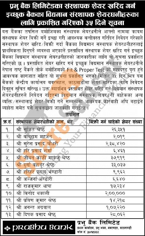 The existing promoter of Prabhu Bank Limited is selling 7,27,543 shares to its promoter shareholders.