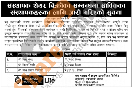 The existing promoter of Prabhu Mahalaxmi Life Insurance Company Limited is selling 3,28,194 shares to its promoter shareholders.
