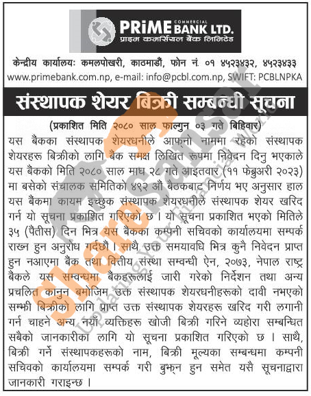 The existing promoter of Prime Commercial Bank Limited is selling shares to its interested promoter shareholders.