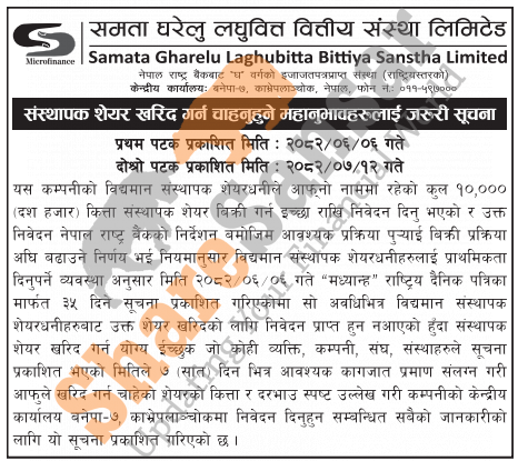 The existing promoter of Samata Gharelu Laghubitta Bittiya Sanstha Limited is selling 10,000 shares to the qualified interested general public/company/institutions.