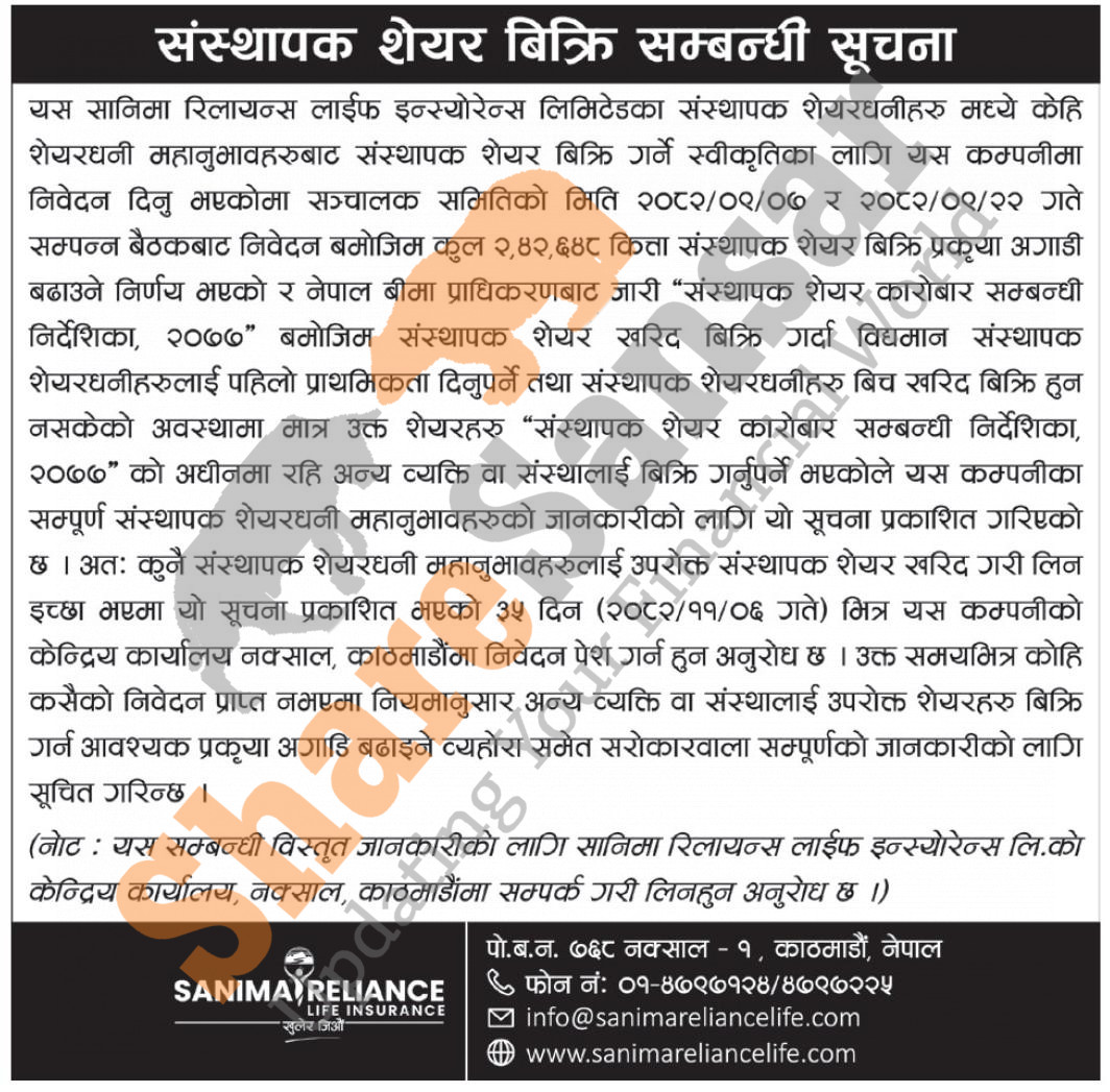 The existing promoter of Sanima Reliance Life Insurance Limited is selling 2,42,648 shares to its promoter shareholders.