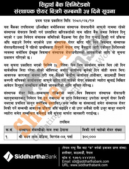 The existing promoter of Siddhartha Bank Limited is selling 3,00,000 shares to its promoter shareholders.