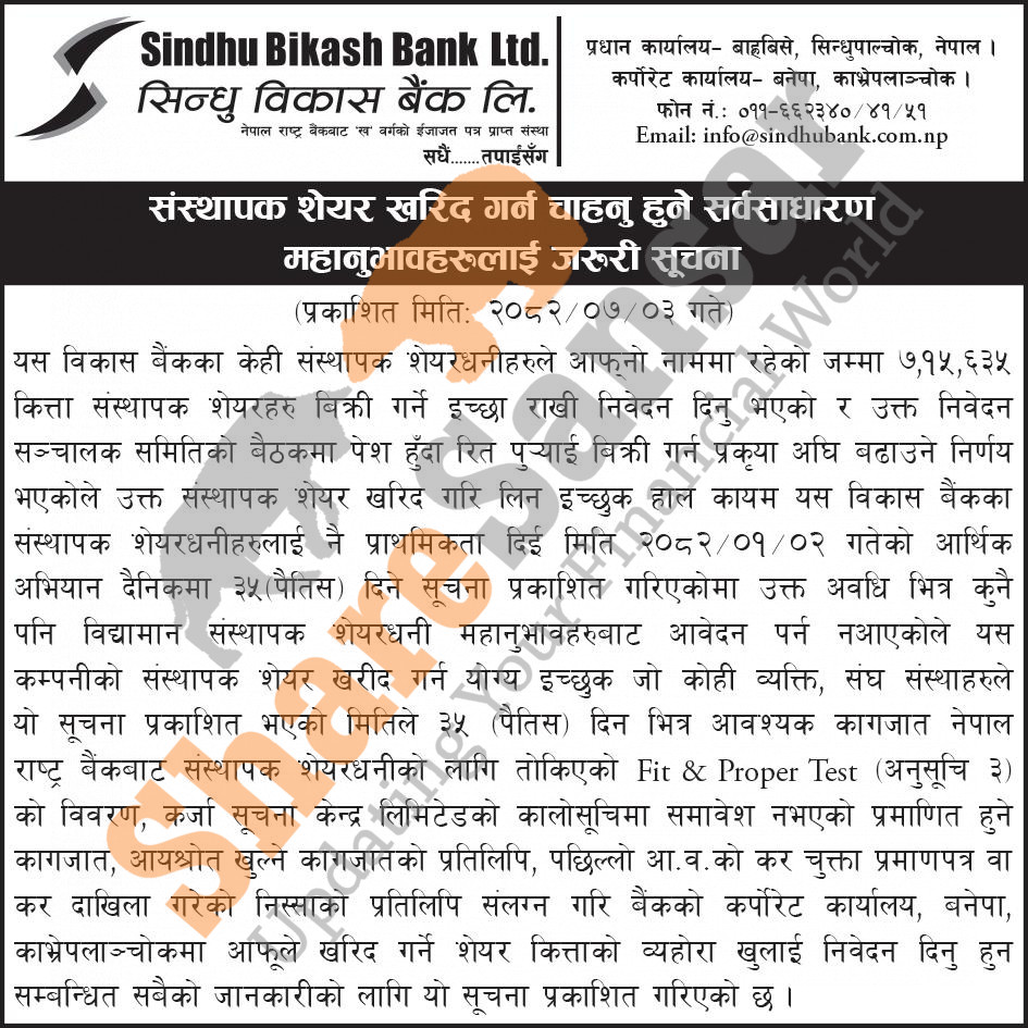 The existing promoter of Sindhu Bikas Bank Limited is selling 7,15,635 shares to the interested general public/institutions.