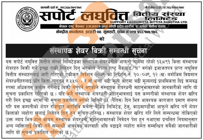 The existing promoter of Support Laghubitta Bittiya Sanstha Limited is selling 13,891 shares to its promoter shareholders.