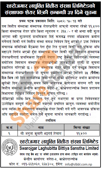 The existing promoter of Swarojgar Laghubitta Bittiya Sanstha Limited is selling 11,500 shares to its promoter shareholders.