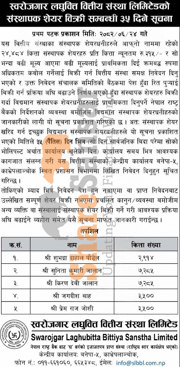The existing promoter of Swarojgar Laghubitta Bittiya Sanstha Limited is selling 24,484 shares to its promoter shareholders.