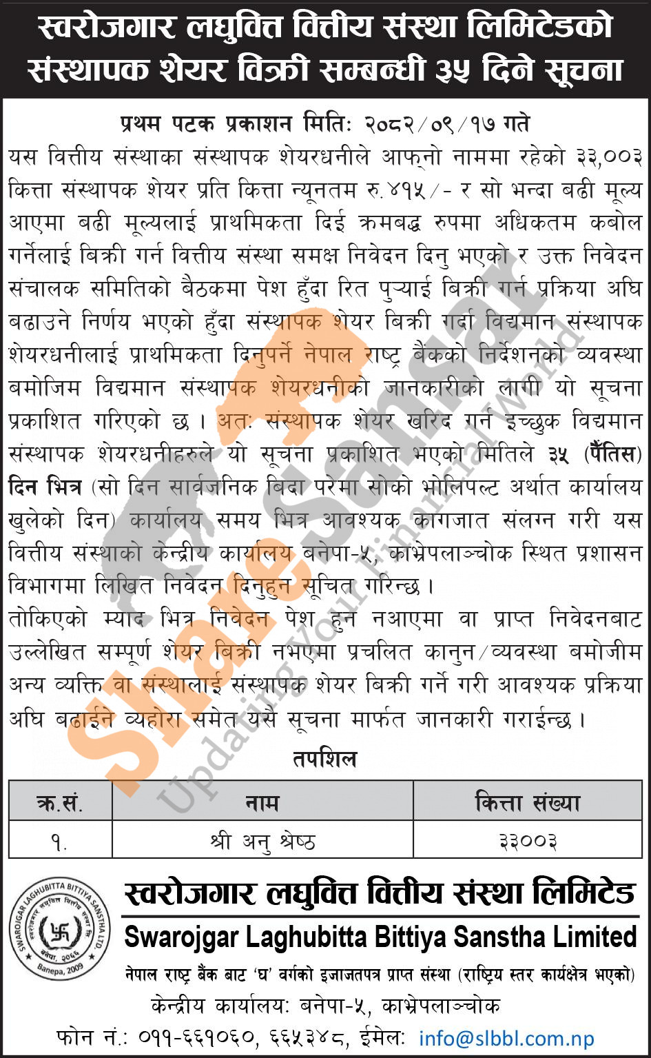 The existing promoter of Swarojgar Laghubitta Bittiya Sanstha Limited is selling 33,033 shares to its promoter shareholders.