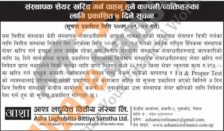 The existing promoters of Asha Laghubitta Bittiya Sanstha Limited is selling 66,990 units shares to public/institutions.