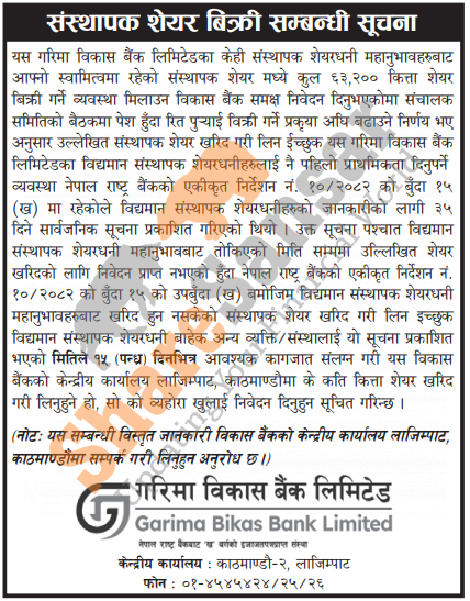 The existing promoters of Garima Bikas Bank Limited is selling 63,200 shares to the general public/institutions.