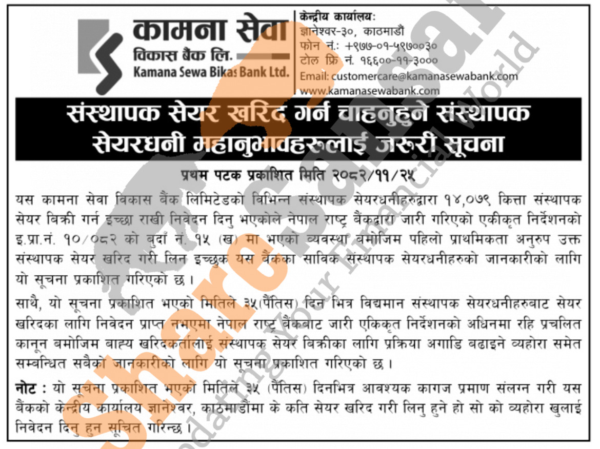 The existing promoters of Kamana Sewa Bikas Bank Limited is selling 14,079 shares to its promoter shareholders.