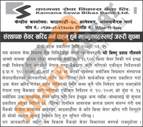 The existing promoters of Kamana Sewa Bikas Bank Limited is selling 16,900 shares to general public/institutions.