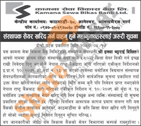 The existing promoters of Kamana Sewa Bikas Bank Limited is selling 57,025 shares to the general public/institutions.