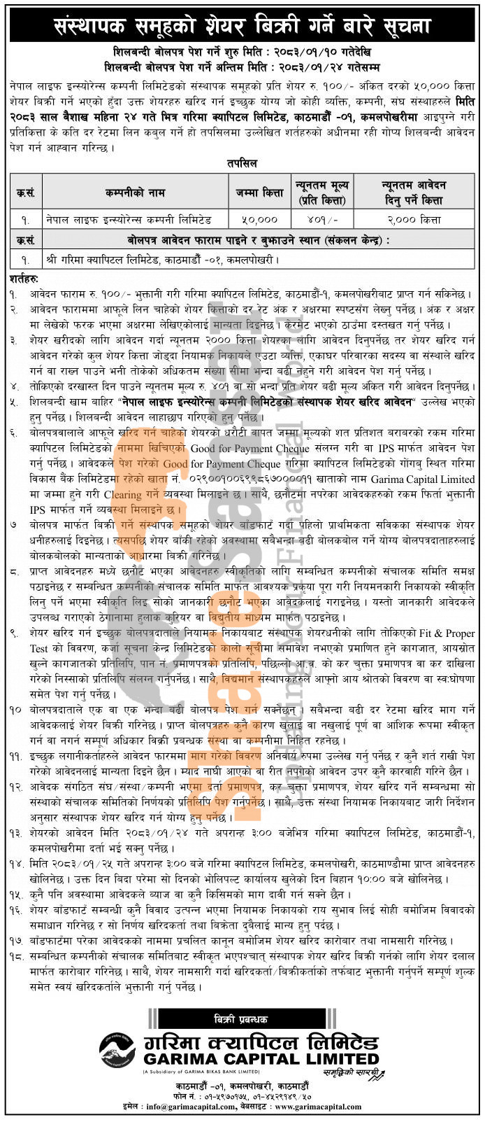 The existing promoters of Nepal Life Insurance Company Limited is selling 50,000 units promoter shares in an auction to the interested person/company/institutions from 10th Baisakh to 24th Baisakh, 2083.