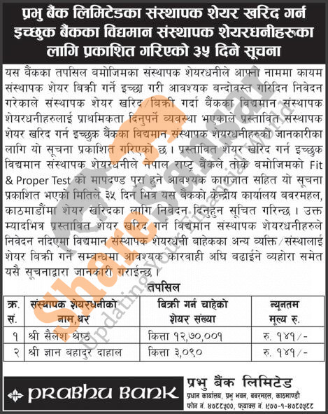 The existing promoters of Prabhu Bank Limited is selling 12,73,091 shares (Rs. 141 each) to its promoter shareholders.