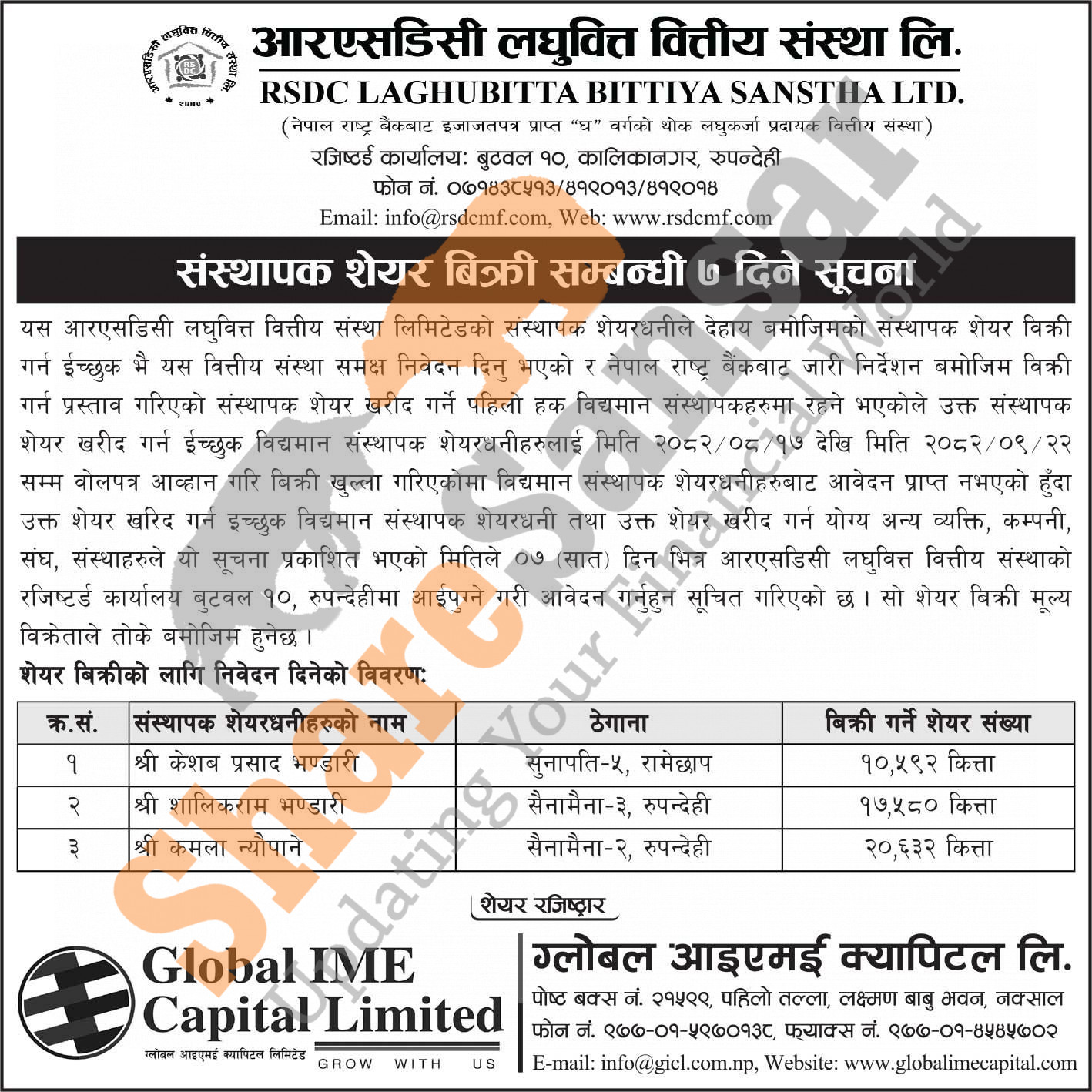 The existing promoters of RSDC Laghubitta Bittiya Sanstha Limited is selling 48,804 shares to its promoter shareholders/general public/company/institutions.