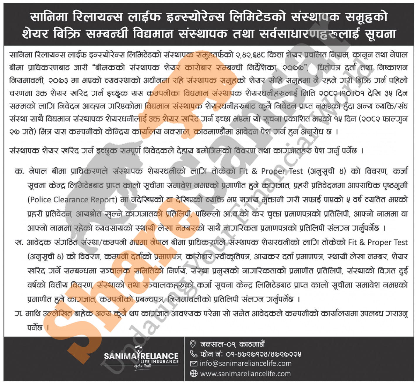 The existing promoters of Sanima Reliance Life Insurance Limited is selling 2,42,648 shares to its promoter shareholders/other person/institutions.