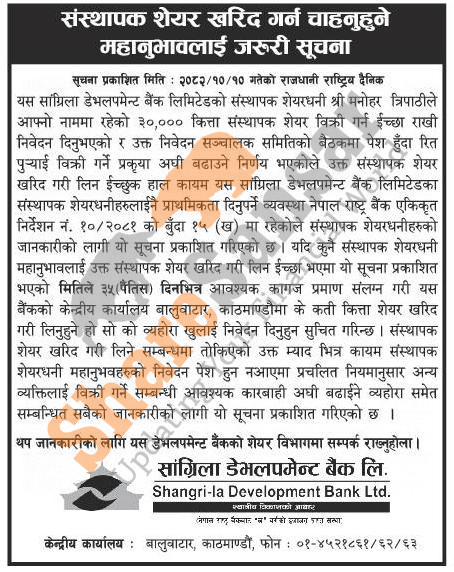 The existing promoters of Shangrila Development Bank Limited is selling 30,000 shares to its promoter shareholders.