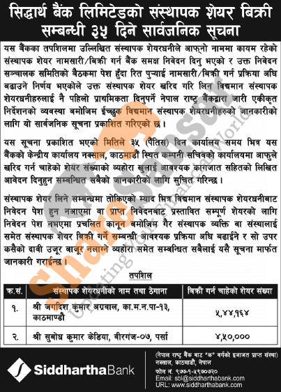 The existing promoters of Siddhartha Bank Limited is selling 9,94,164 shares to its promoter shareholders.