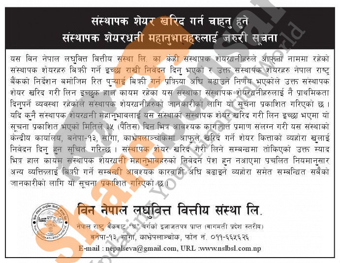 The existing promoters of Wean Nepal Laghubitta Bittiya Sanstha Limited is selling shares to its promoter shareholders.
